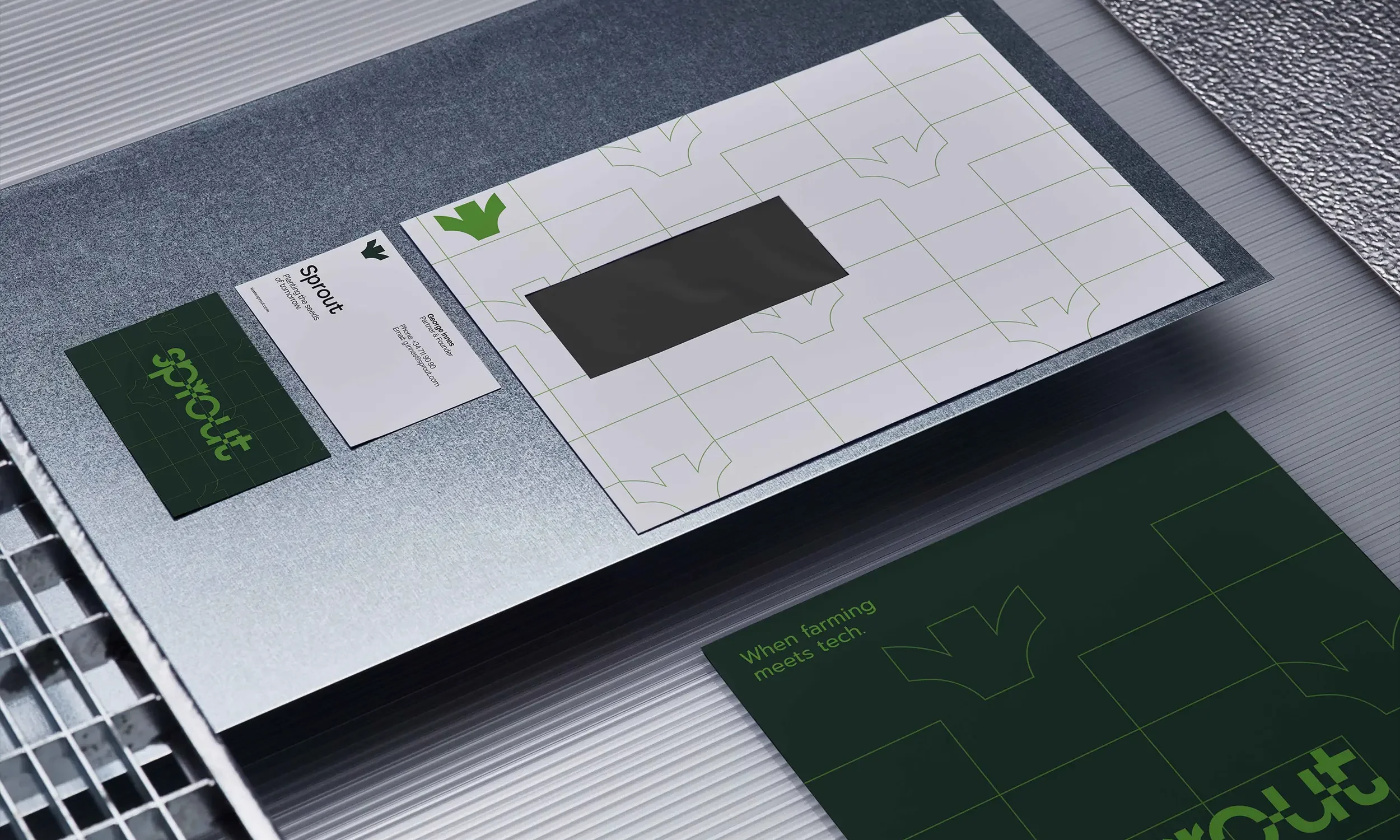 The logotype embodies this balance, split through the center and connected by a central block, symbolizing technology and ecology. The custom ‘r’ sprouts upward, a subtle hint to growth and sustainability. These forms inspired a modular grid system, giving the brand a flexible, cohesive visual language.
